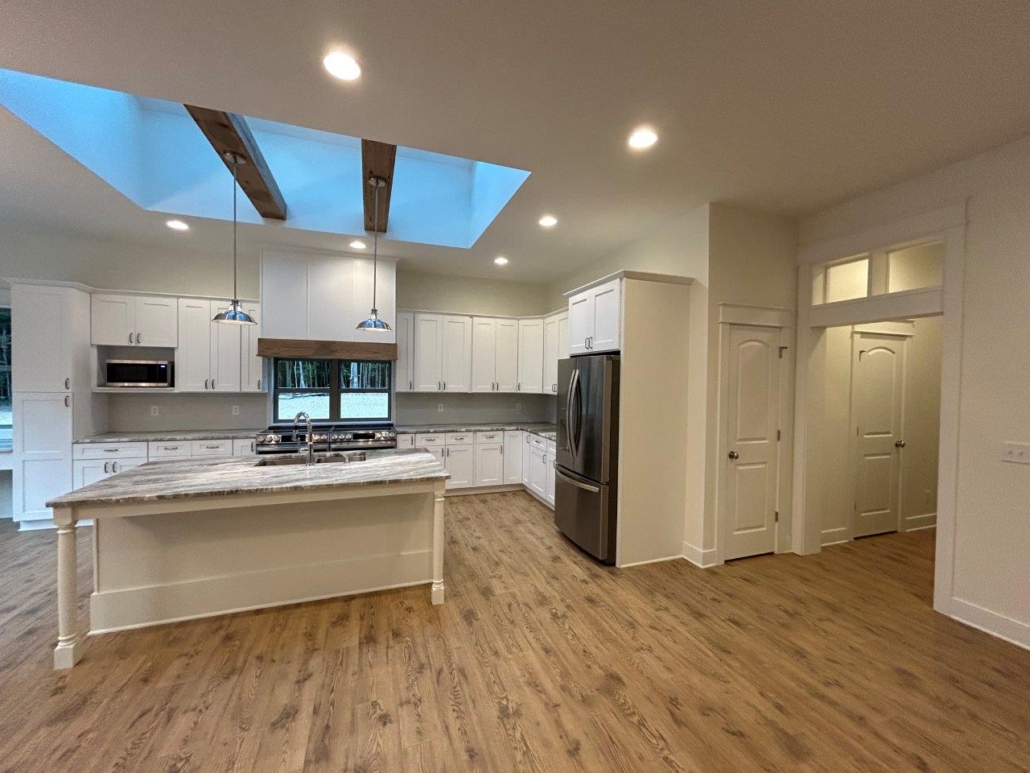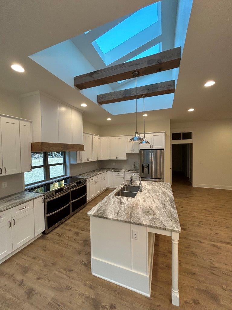 Some clients have a really good idea of exactly what they want, but they just need help with execution. Such was the case with this new build. The homeowner had very specific wishes for the layout, general architectural style, and the finishes, but looked to us to make it happen cost effectively and in a timely manner. Along the way, the client looked to us to create a fantastic skylight addition to the kitchen and a double porch to the facade. This is truly custom building.